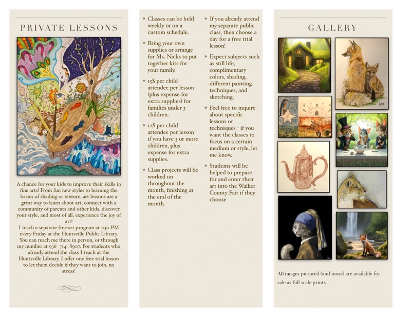 I teach private and group art classes for kids ages 6-12. In addition, I have been teaching a popular, free public class at the Huntsville Public Library as a volunteer since I was fourteen.